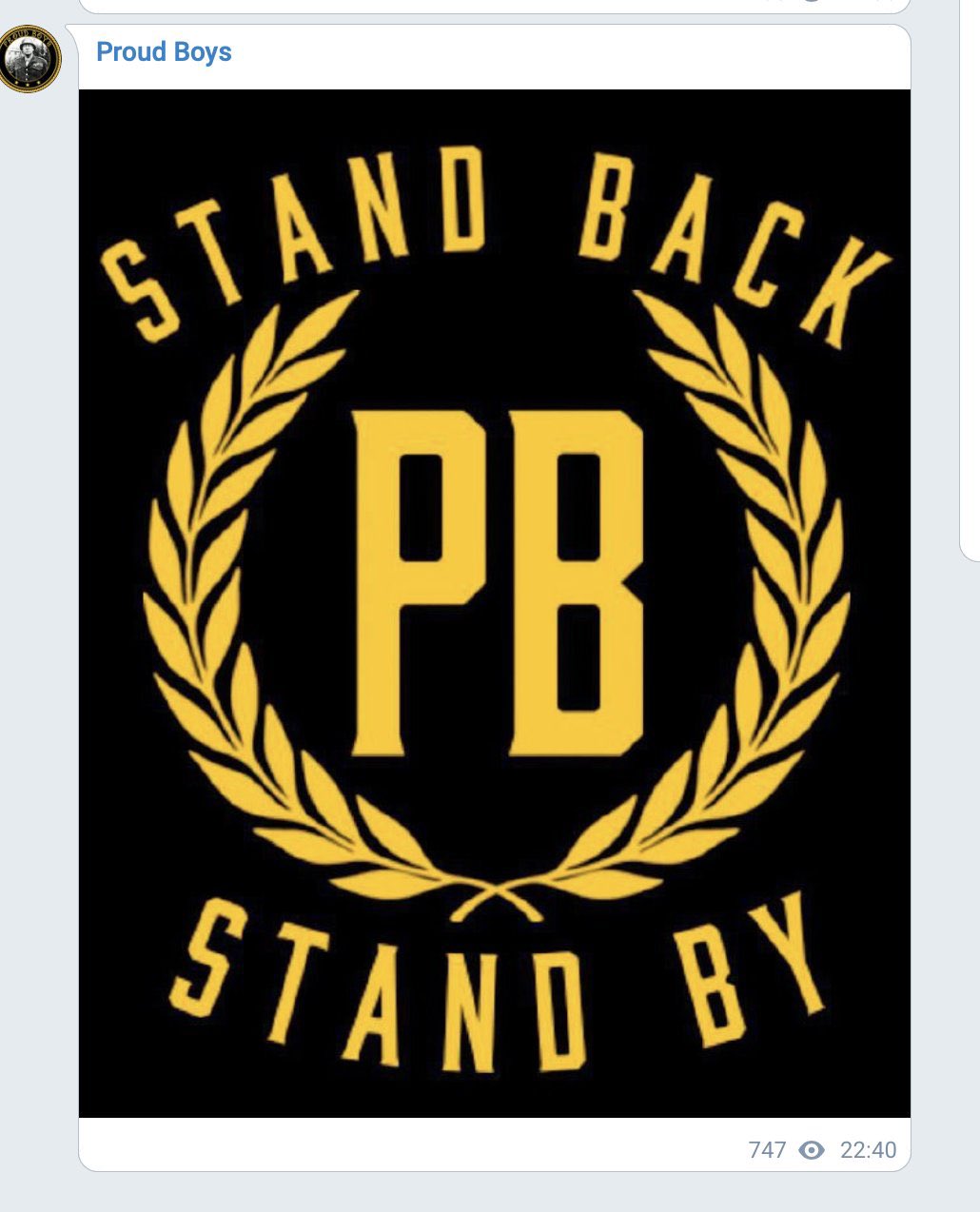 (1) A los supremacistas blancos (los «Proud Boys» y otros) les dice «Stand by» («¡Estén preparados!»). Los «Proud Boys» son un grupo militante y violento de racistas, muchos de cuyos miembros han sido llevados a los tribunales, y que en semanas recientes ha concentrado a sus miembros en Portland, Oregon, para atacar a manifestantes que marchaban contra la brutalidad policial. El grupo ha sido vetado por las redes sociales, aunque sus miembros encuentran maneras de evadir la prohibición. De hecho, celebraron en las redes el apoyo del actual Presidente añadiendo las palabras de este a su escudo.