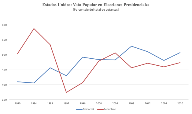 Hay que añadir que los Demócratas han superado [50.8% hasta la fecha, y en aumento], la barrera del cincuenta por ciento, que es menos rutinaria de lo que quizás se cree: en cuatro de las once votaciones nacionales de los últimos 40 años, el candidato ganador recibió menos de la mitad de los votos. El porcentaje que viene acumulando Biden/Harris se acerca al cuarto lugar, superado apenas en la reelección de Ronald Reagan (1984, 58.8%), la elección de G.W.H Bush (1988, 53.1%), y la victoria de Obama (2008, 52.9%); es muy probable, a estas alturas, que se borre la diferencia marginal entre Biden/Harris y Obama II (51.1%). [Véase gráfico]
